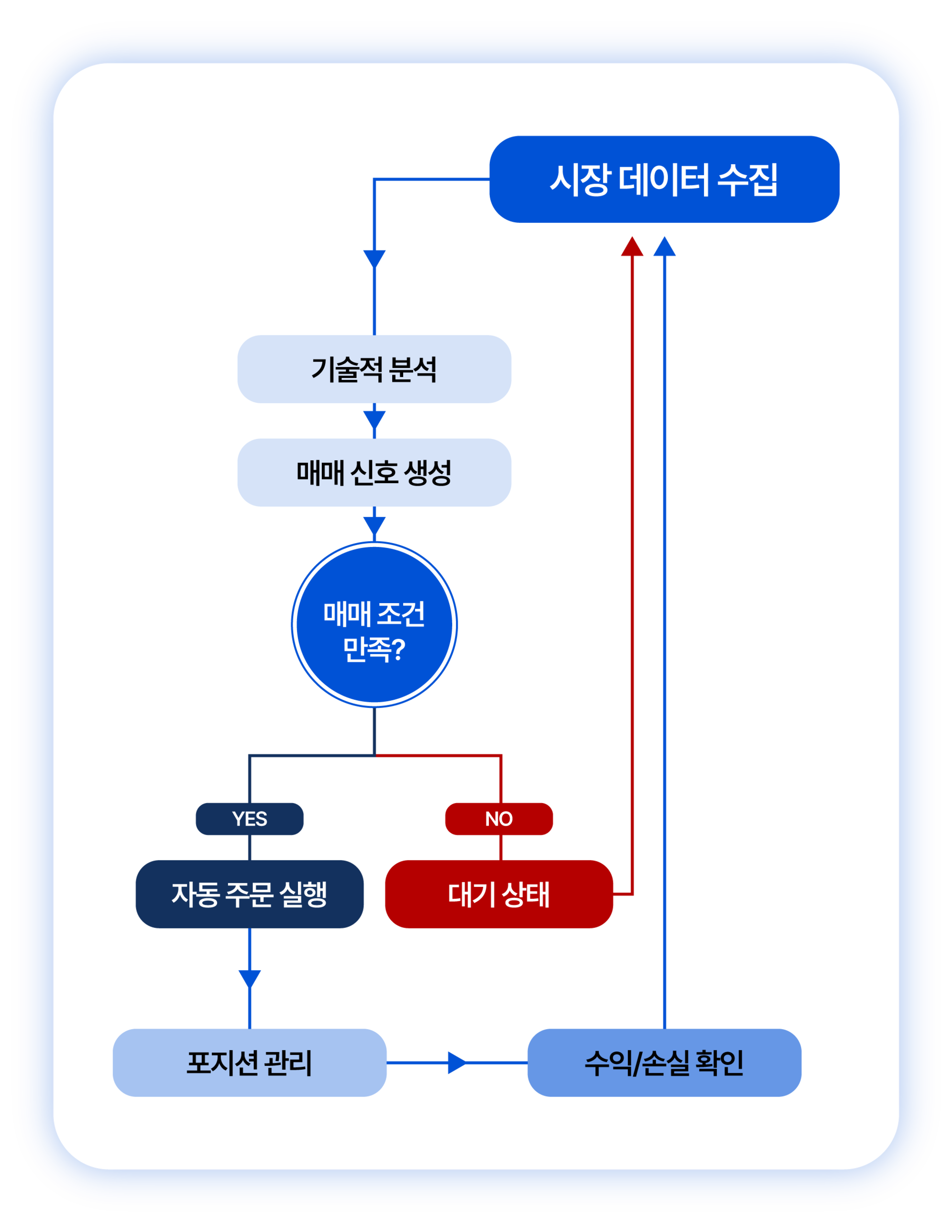 설정된 알고리즘에 따라 매매 조건 만족 여부를 분석합니다.